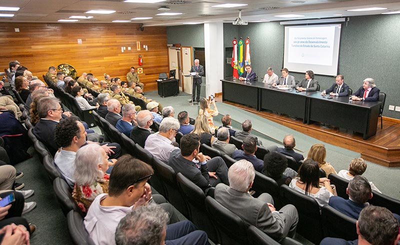 Saudando os homenageados da noite, o ex-governador Leonel Pavan destacou que foi autor da lei que criou a comissão de turismo no Congresso Nacional, o que levaria posteriormente à criação do Ministério do Turismo, assim como a implantação do Geoparque em Santa Catarina, na condição de secretário de Turismo, o terceiro maior do país.