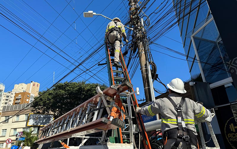 O trabalho de fiscalização da Celesc abrange a regularização e limpeza de cabeamento na rede compartilhada, atentando para cabos em situação de clandestinidade, à revelia/irregular, fora dos padrões técnicos e fiação desativada.