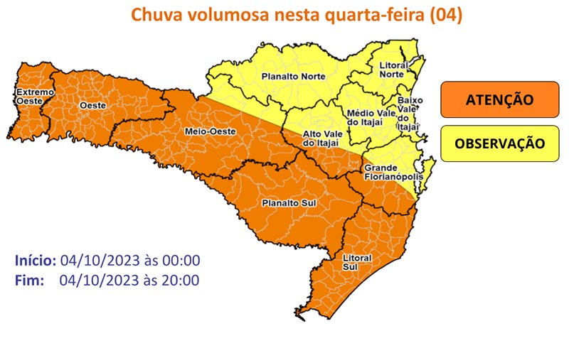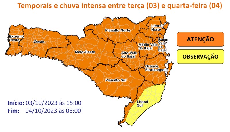 A Defesa Civil de Santa Catarina emitiu dois avisos meteorológicos para o estado: um sobre temporais e o outro sobre chuva volumosa, estas condições ocorrem devido a uma atuação de frente fria que se aproxima. Entre a tarde desta terça 3, e a madrugada de quarta, 4, estão previstos temporais em todo o estado, acompanhados de rajadas de vento e chuvas intensas.
