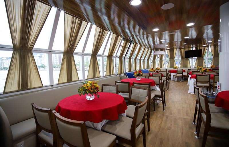 Também contempla dois bares com todos os tipos de bebidas com e sem álcool, além de drinks instagramáveis feitos por barmans especializados. Um dos bares fica no deck superior, com música ao vivo, onde também se poderá dançar e confraternizar. Já o segundo deck é destinado para aqueles que querem contemplar a natureza, o pôr do sol, ou seja, curtir o passeio sem perder nenhum detalhe.