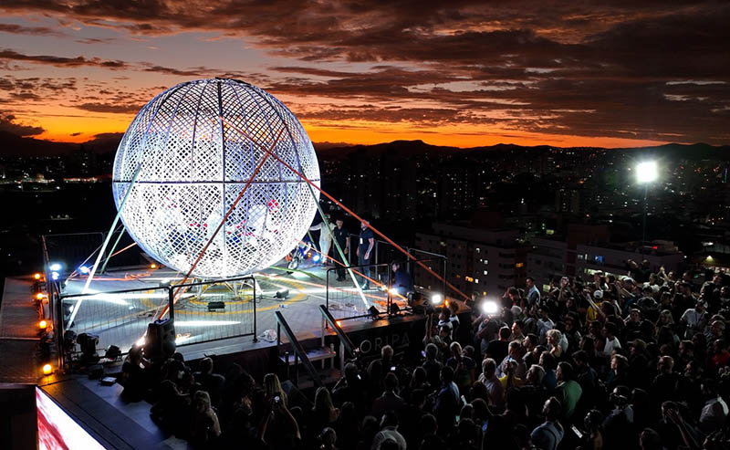 O Globo da Morte usado nas apresentações tem 4,8 metros de diâmetro e pesa quase três toneladas. Todas as peças foram içadas para o alto do prédio num trabalho que durou dois dias. “Foi muito desafiador, muita dificuldade trazer esse globo da morte para cima. Quando a gente achou que era simples, só colocar as peças no elevador, de repente nem pela escada foi possível. Realmente foi difícil demais, mas valeu demais. A equipe do rapel, que estava subindo as peças, me falou depois da apresentação que ‘valeu cada puxada de corda que a gente fez aqui, porque foi lindo demais, foi maravilhoso’, comenta Sócrates.
