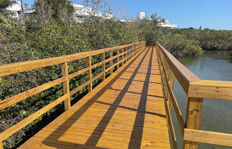 O novo deck pode ser acessado pelo estacionamento ao lado do condomínio residencial Marine Home & Resort, que fica localizado na Avenida Luiz Boiteux Piazza, nº 4.413. O novo equipamento teve cerca de 90% da fundação em escora de eucalipto refeita, e toda a estrutura de base como piso e guarda-corpo também de madeira renovados.
