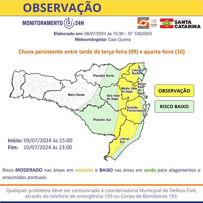 As condições meteorológicas em Santa Catarina continuam instáveis ao longo da semana. De acordo com a equipe de monitoramento da Defesa Civil, na terça-feira , 9, a formação de um novo sistema de baixa pressão entre a costa catarinense e o sudeste do Brasil traz de volta o tempo instável. Entre os Planaltos e o Litoral, o risco para ocorrências será de baixo a moderado, com chuva persistente até pelo menos o final da quarta-feira, 10. As regiões litorâneas, Médio Vale, Planaltos e Alto Vale do Itajaí poderão enfrentar alagamentos e enxurradas pontuais, especialmente nas áreas de encosta.