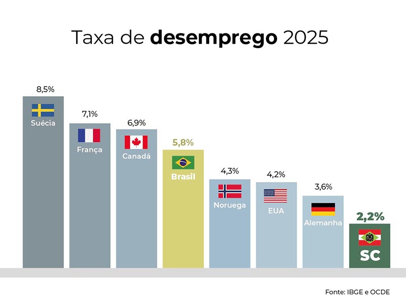A comparação entre Santa Catarina e outros países é feita com base em dados públicos da OCDE, grupo de nações onde a metodologia de pesquisa sobre desemprego é semelhante e permite relações diretas. O percentual catarinense é referente ao segundo trimestre de 2025, conforme o IBGE. Já os dados dos países são referentes a março e abril, os mais recentes disponíveis.