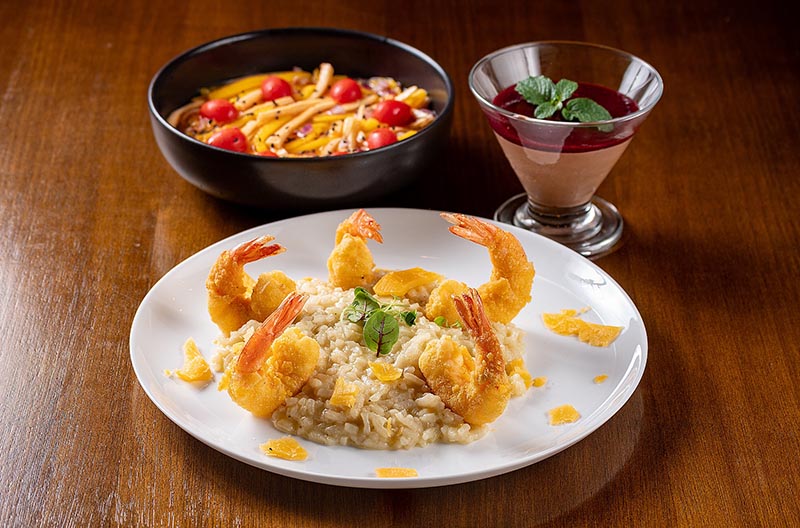 Prato Principal: tagliatelle artesanal com duxelle de cogumelos e camarões grelhados. Sobremesa: fondant de chocolate, curd de laranja, frutas vermelhas e sorvete de baunilha.